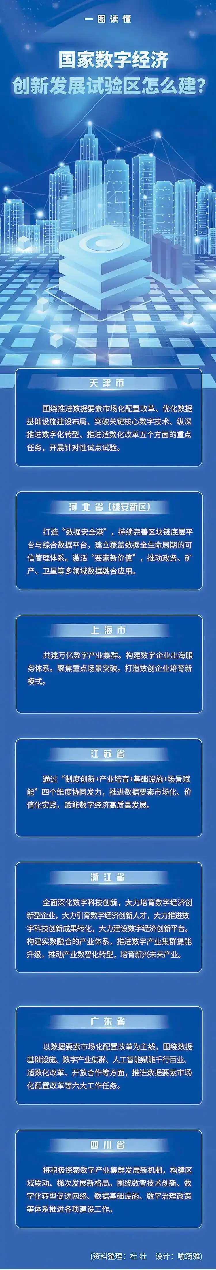 3个多月前,国家数据局正式函复天津市、河北省(雄安新区)、上海市、江苏省、浙江省、广东省、四川省等7个地方国家数字经济创新发展试验区(以下简称“试验区”)建设方案,围绕数据要素市场化配置改革、基础设施建设、生产力布局和区域合作、科技创新和产业创新深度融合、场景应用拓展、对外合作、适数化改革等七个方面158项举措开展试点试验,为全国数字经济改革按下“加速键”。